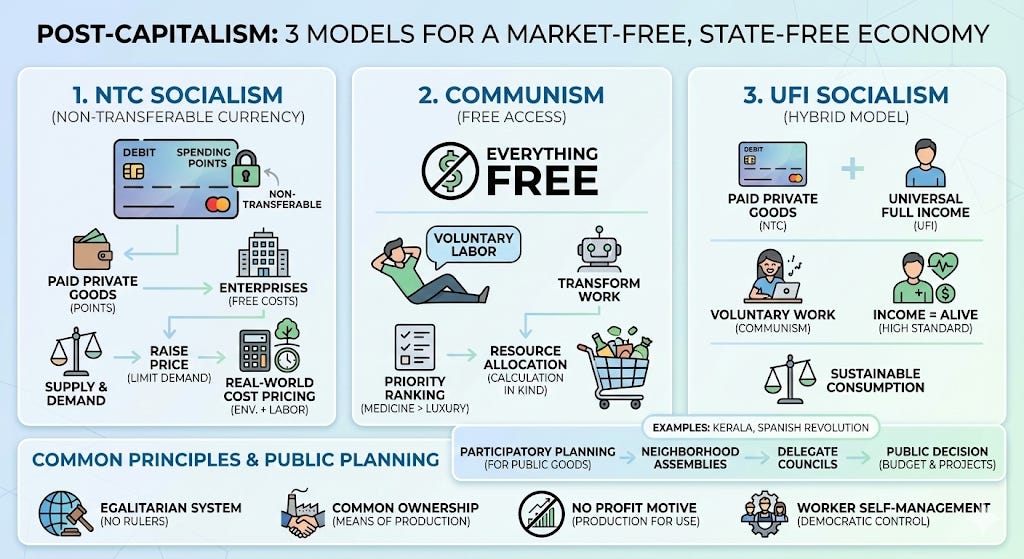 Capitalism assumes scarcity and competition as defaults. Post-capitalist systems assume coordination and sufficiency.